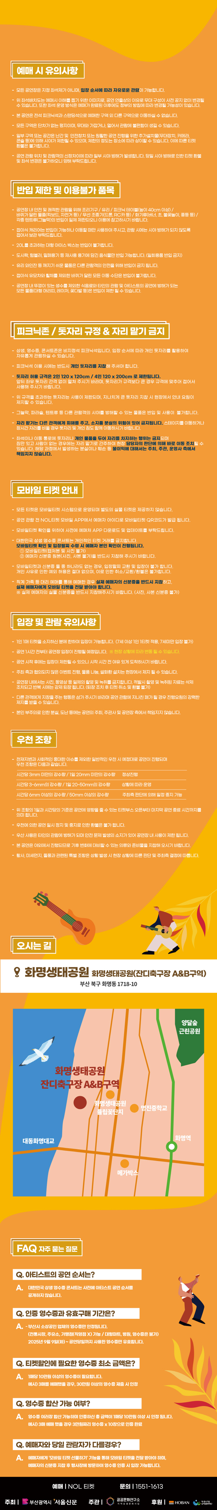공연은 양일 모두 같은 시간에 시작되며, 좌석은 구역 지정 후 자유석으로 운영됩니다. 공연 당일 현장에서 1만원 상품교환권으로 입장 팔찌 교환 후 입장할 수 있습니다.